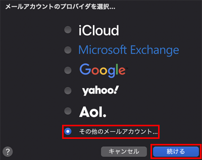 一番下の『 その他のメールアカウント 』を選択し、『 続ける 』をクリックします。
