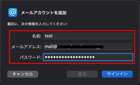以下項目を入力し、『 サインイン 』をクリックしますと、アカウントの追加が完了します。