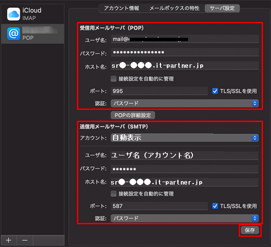 | 受信用メール サーバー | 初期ドメイン(※) (sr●-●●●.it-partner.jp or mail.~) |