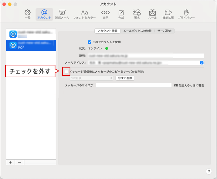 複数台で今回設定したメールアドレスを使用される場合、アカウント情報へ戻り、メッセージ受信後にメッセージのコピーをサーバから削除のチェックを外します。