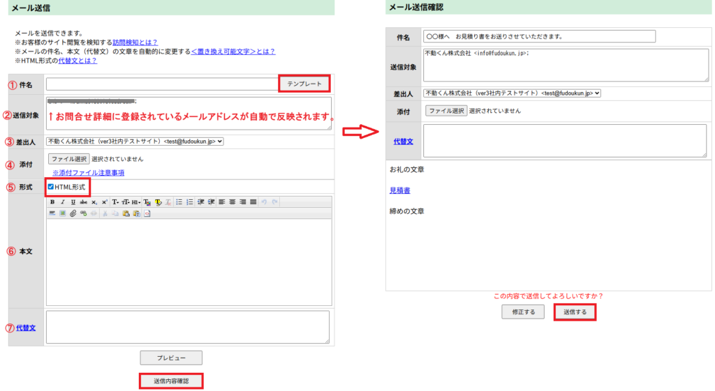 ①件名:送信するメールの件名を入力してください。テンプレートから選択することも可能です。