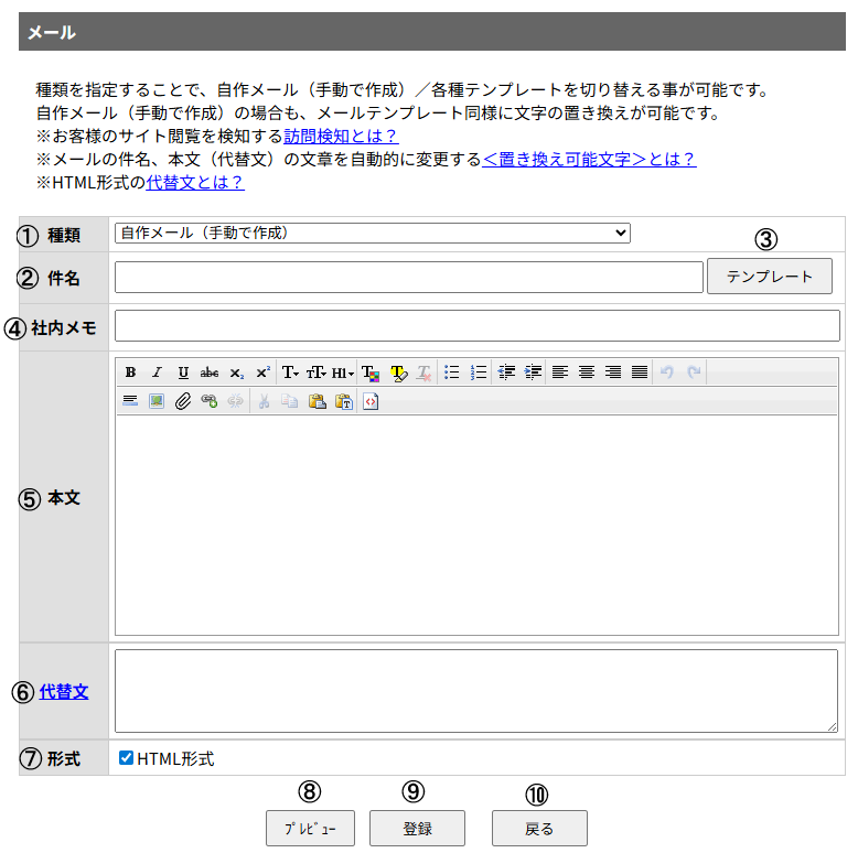 ※⑥代替え文は①で「自作メール(手動で作成)」を選択し⑦にチェックを付けると表示されます。
