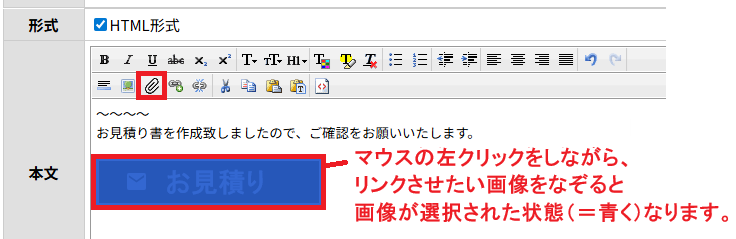 リンクさせたい画像を選択した状態で、「ファイルアップロード」のアイコンをクリックすると、