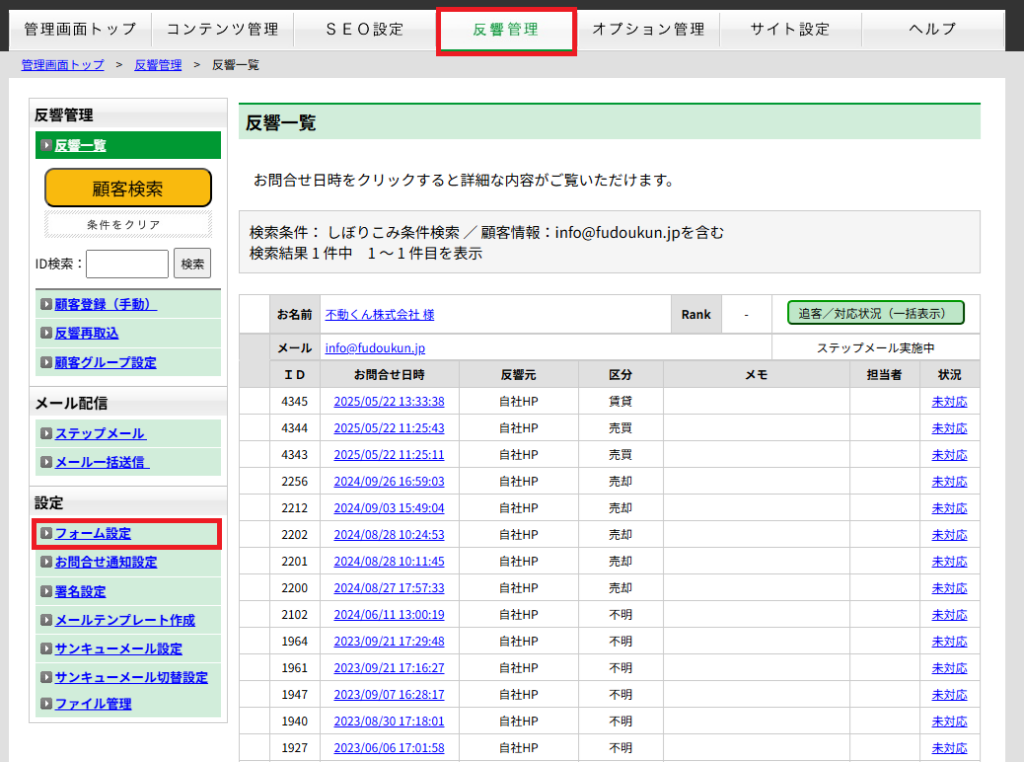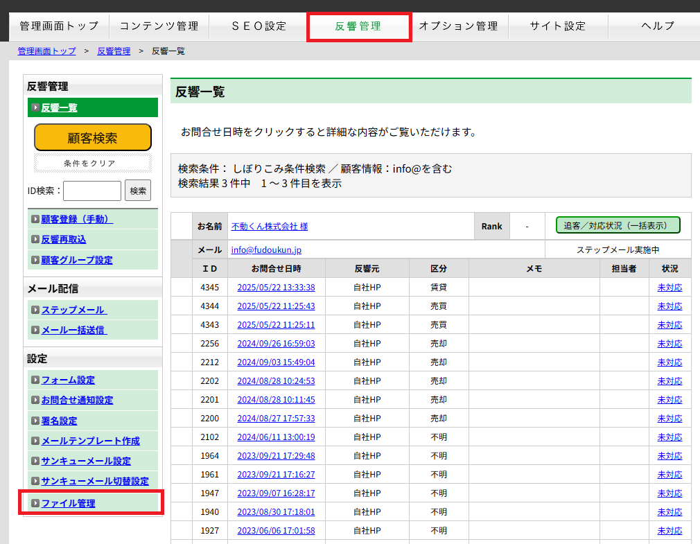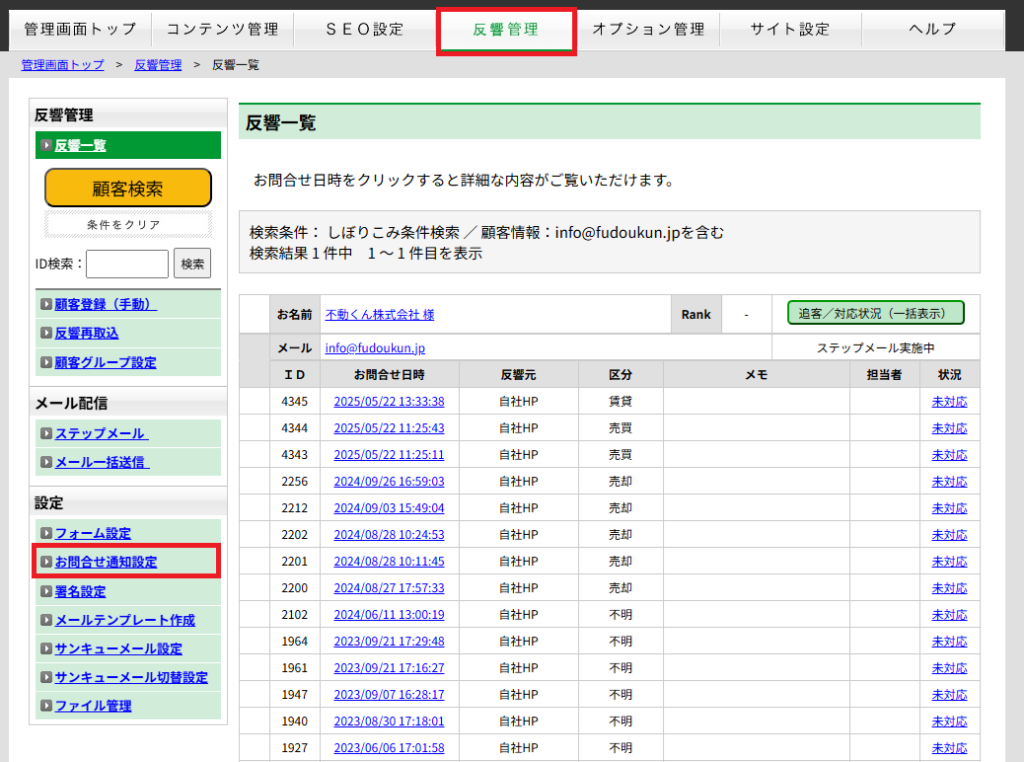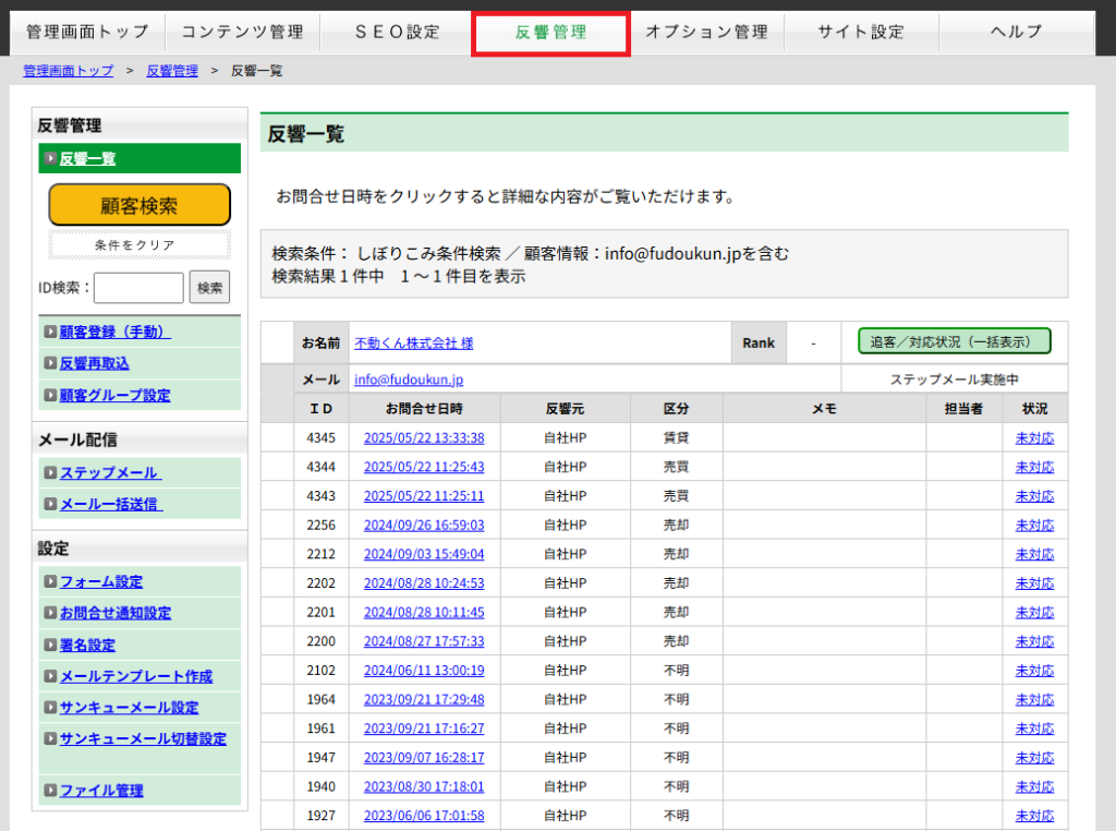 ■反響管理(オプションを申込した場合の画面表示)