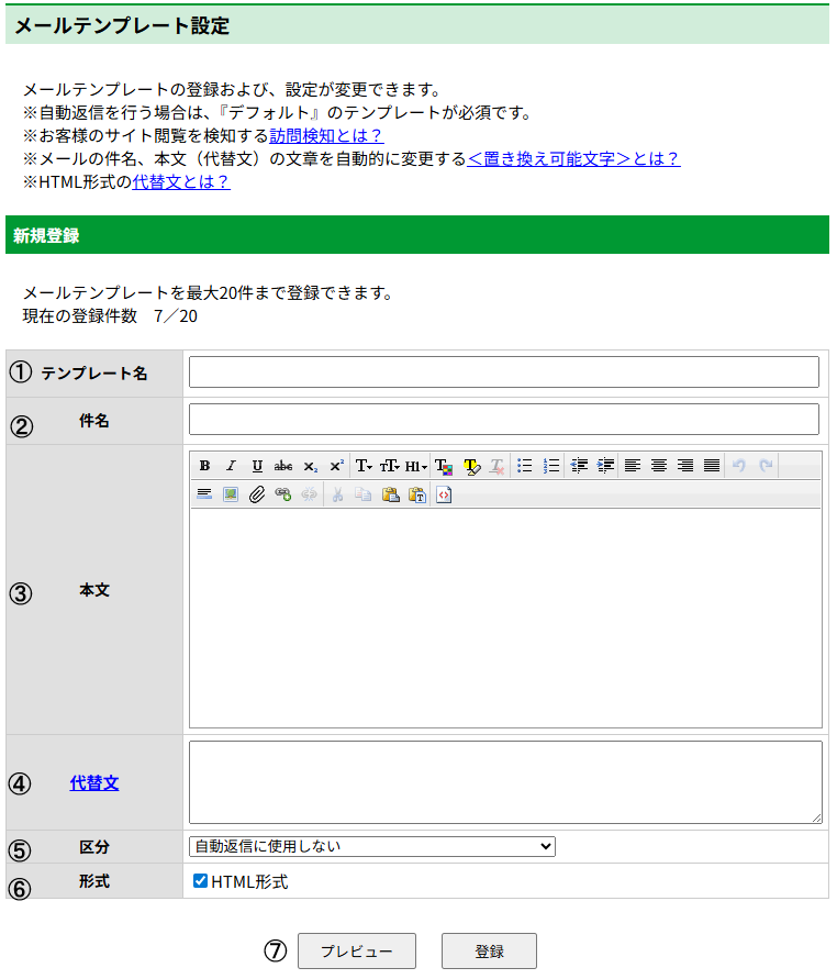⑦プレビュー … プレビューを表示すると送信されるメール文が確認できます。