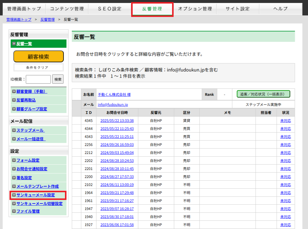 反響管理>サンキューメール設定 にてサンキューメールを配信する・しない の設定を行います。